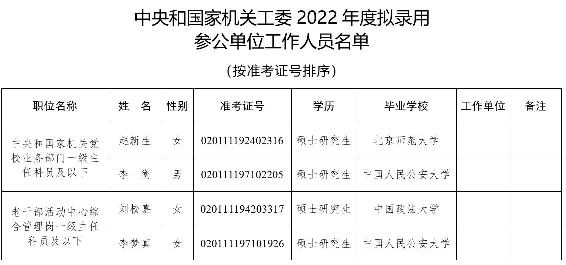 根據(jù)2022年度中央機關(guān)及其直屬機構(gòu)考試錄用公務(wù)員工作有關(guān)要求,經(jīng)過筆試、面試、體檢和考察等程序,擬錄用趙新生等4人為中央和國家機關(guān)工委參公單位工作人員,現(xiàn)予以公示。公示期間如有問題,請向中央和國家機關(guān)工委組織部反映。