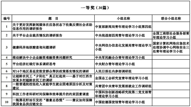 經各部門機關黨委推薦、有關科研機構復評和領導專家終評,最終評選產生了251篇優秀調研成果,其中特等獎10篇(并獲“十佳調研報告”稱號),一等獎30篇,二等獎60篇,三等獎151篇。獲獎名單如下: