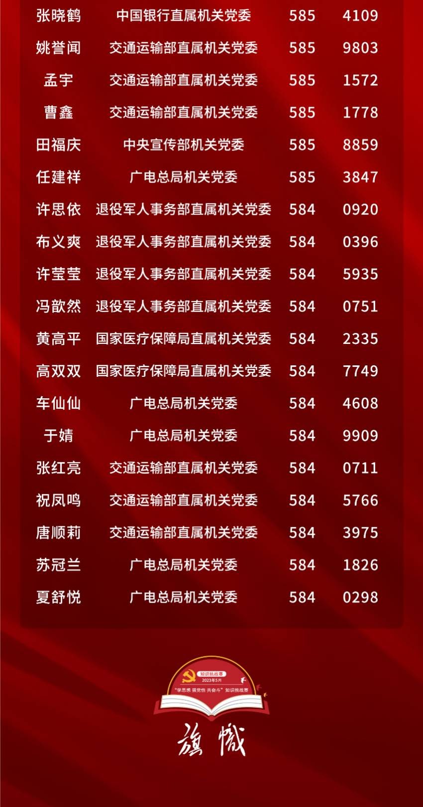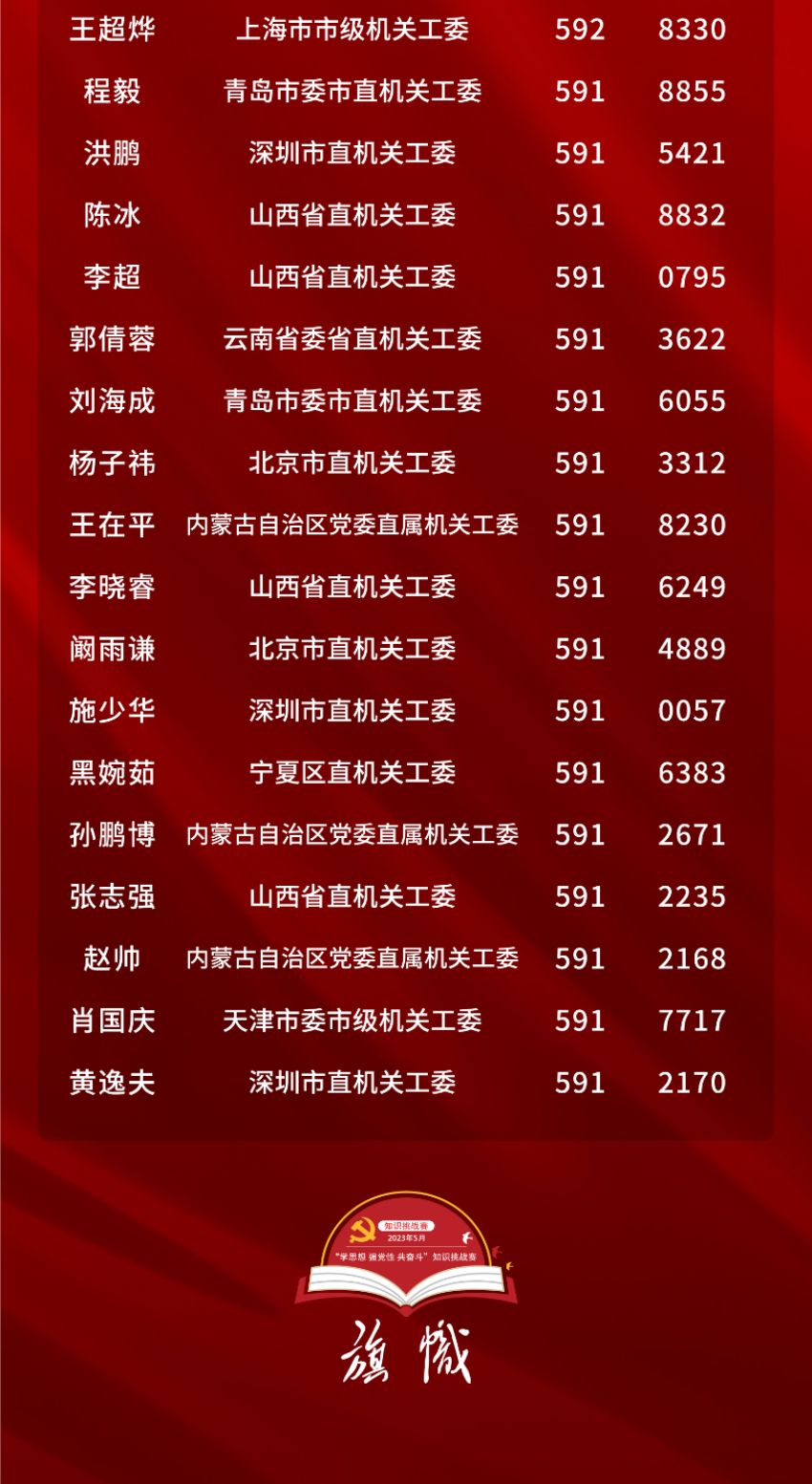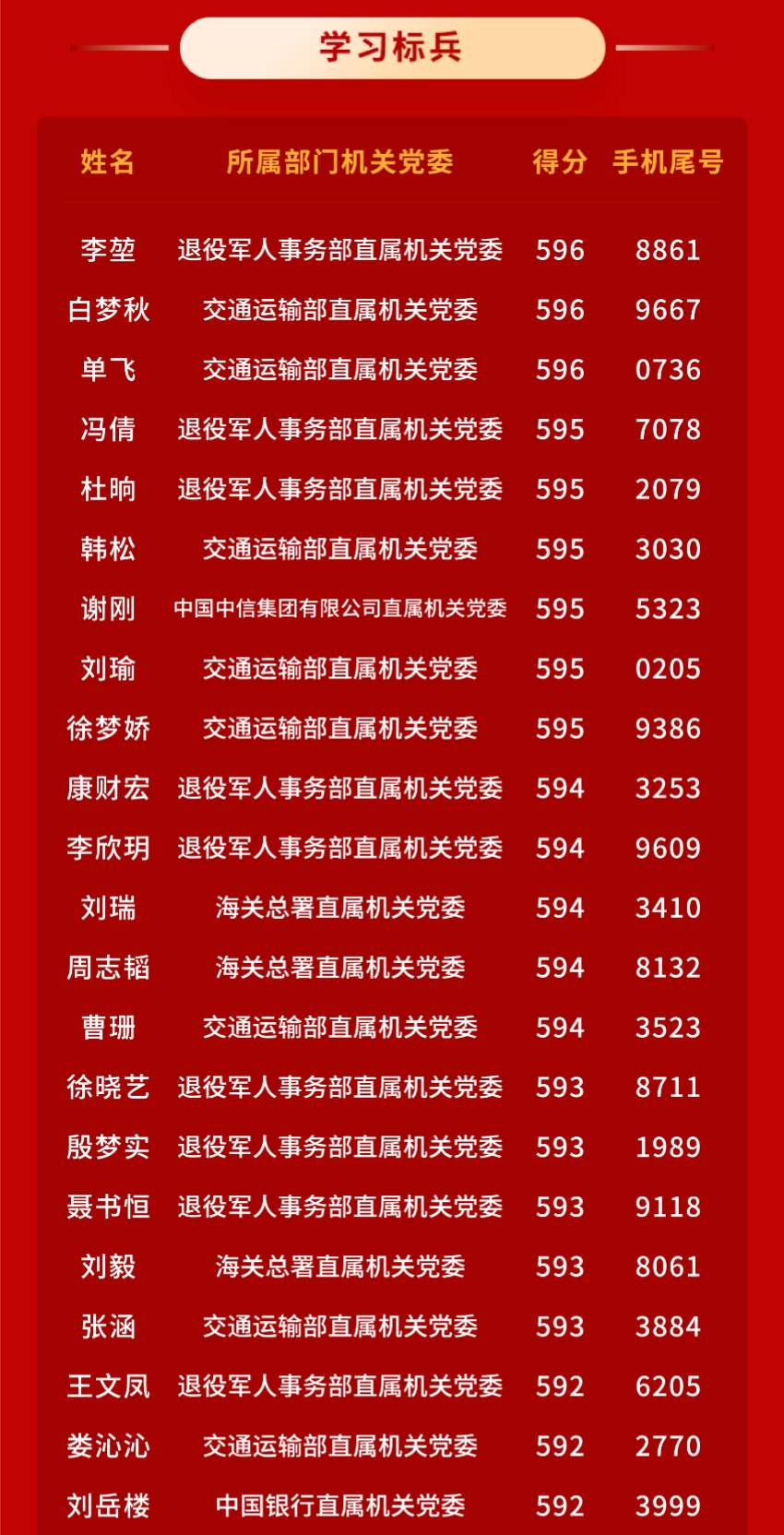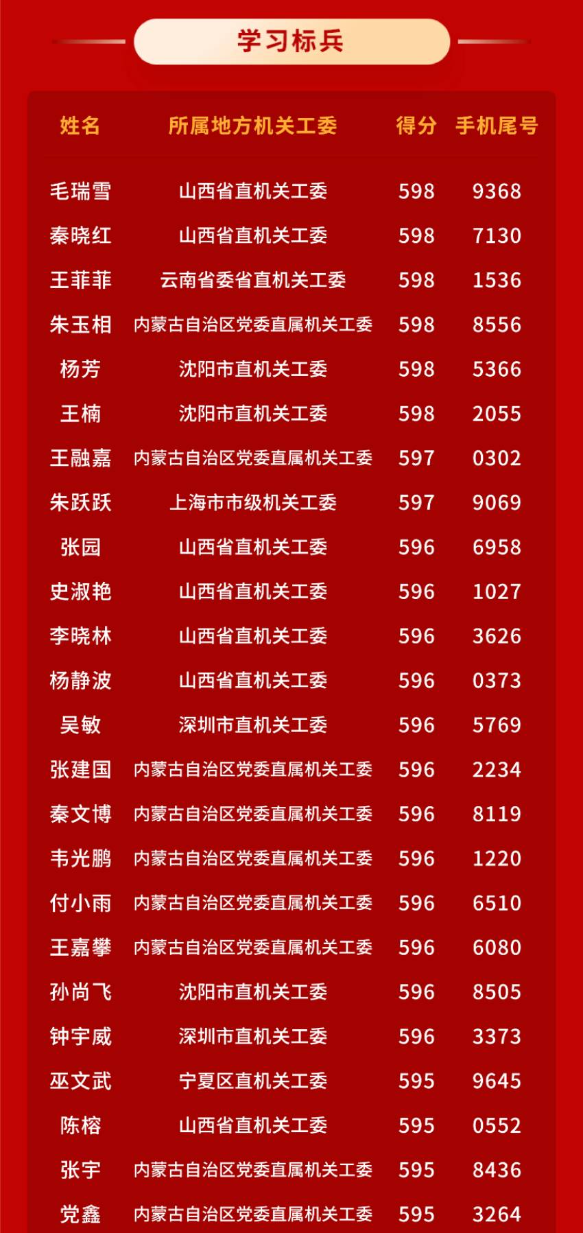 初賽階段已于6月9日順利結(jié)束,在線累計(jì)對(duì)局?jǐn)?shù)超過(guò)1600萬(wàn)場(chǎng),參賽選手們積極踴躍、奮勇爭(zhēng)先,學(xué)習(xí)習(xí)近平新時(shí)代中國(guó)特色社會(huì)主義思想和機(jī)關(guān)黨建知識(shí)的氛圍日益濃厚,共有18名選手獲得了滿分成績(jī)。為鼓勵(lì)在知識(shí)挑戰(zhàn)賽初賽階段表現(xiàn)突出的參賽選手,根據(jù)《“學(xué)思想 強(qiáng)黨性 共奮斗”知識(shí)挑戰(zhàn)賽初賽階段獎(jiǎng)項(xiàng)設(shè)置和獎(jiǎng)勵(lì)辦法》,現(xiàn)將中央和國(guó)家機(jī)關(guān)賽區(qū)、地方機(jī)關(guān)賽區(qū)“十佳學(xué)習(xí)標(biāo)兵”“學(xué)習(xí)標(biāo)兵”獲獎(jiǎng)名單通報(bào)如下: