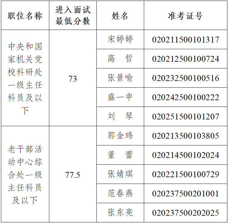根據筆試成績由高到低順序,按照5:1的比例,確定參加面試人員。面試人員名單如下(按照準考證號排序):