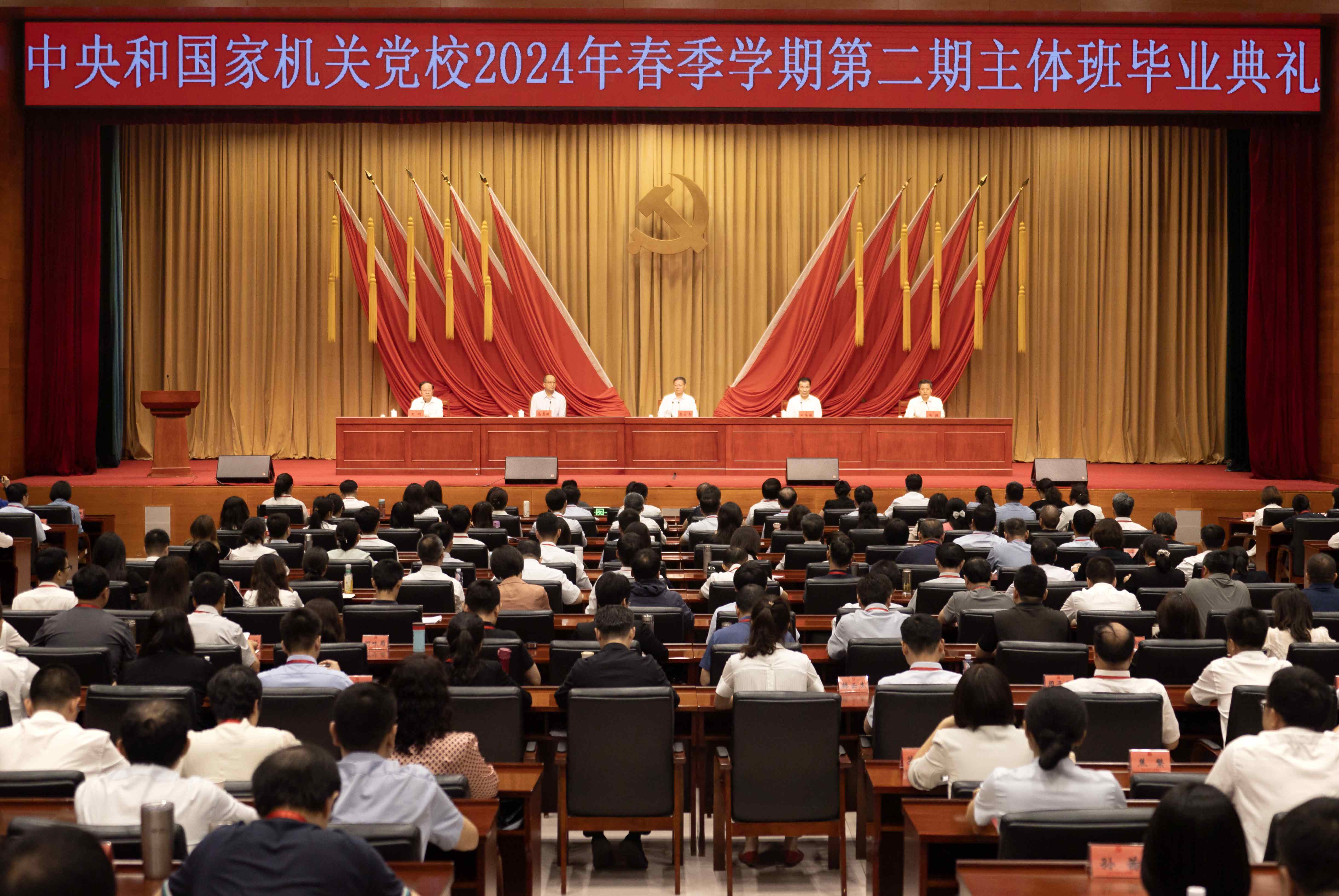 中央和國家機關工委委員、組織部部長、中央和國家機關干部教育辦公室主任閃偉強出席畢業典禮。2024年春季學期第二期司局級干部進修班、處級干部進修班、處級青年干部培訓班、科級青年干部培訓班全體學員等360余人參加畢業典禮。