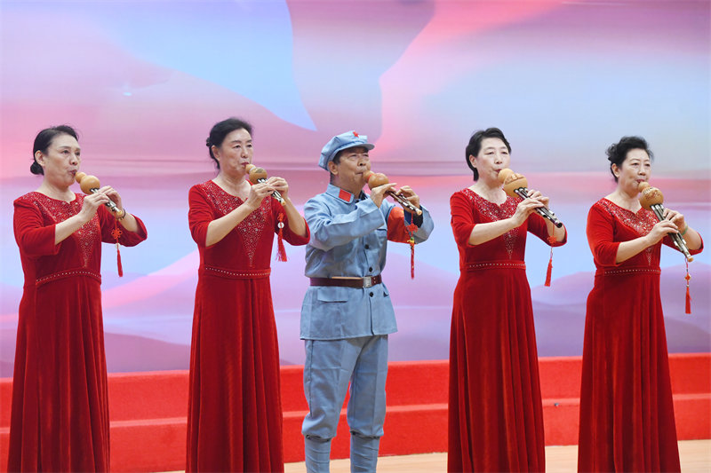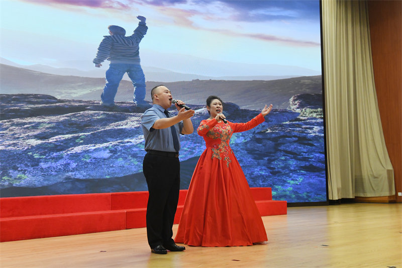 下午的正式演出以歌頌偉大祖國、贊美偉大共產(chǎn)黨為主旋律,在飽含深情的混聲大合唱《我的祖國》中拉開序幕?!段液臀业淖鎳贰ⅰ队L飄揚的旗》鏗鏘的旋律,充沛的情感,唱響愛黨愛國強音。歌曲《草原上升起不落的太陽》、舞蹈《長鼓敲起來》展現(xiàn)了全國各族人民在中國共產(chǎn)黨帶領(lǐng)下的幸福生活。合唱團團員與學員的對唱歌曲《少年壯志不言愁》唱出公檢法人員忠于黨、忠于祖國、忠于人民的赤膽忠心。演出還邀請中央和國家機關(guān)老年大學葫蘆絲班師生表演合奏《十送紅軍》,表達了革命根據(jù)地人民對紅軍的深厚感情。