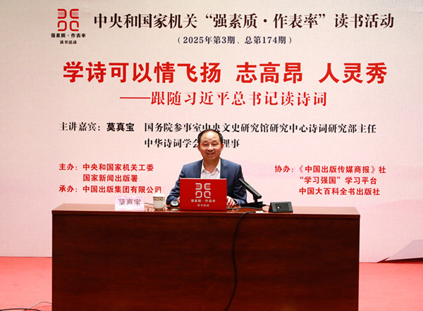 在第30個“世界讀書日”到來之際,為落實習近平總書記在致首屆全民閱讀大會的賀信中提出的“廣大黨員、干部帶頭讀書學習,修身養志,增長才干”重要要求,4月25日,中央和國家機關“強素質·作表率”讀書活動舉辦2025年第3期主題講座。國務院參事室中央文史研究館研究中心詩詞研究部主任、中華詩詞學會常務理事莫真寶以《學詩可以情飛揚 志高昂 人靈秀——跟隨習近平總書記讀詩詞》為題作講座。中央和國家機關各部門黨員干部300余人參加。