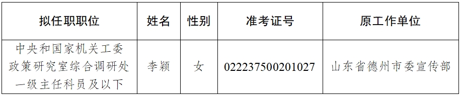 根據2025年度中央機關公開遴選工作有關要求,經過筆試、面試、體檢和考察等程序,經研究,確定李穎同志為中央和國家機關工委公開遴選公務員擬任職人員,現予以公示。公示期間如有問題,請向中央和國家機關工委組織部反映。
